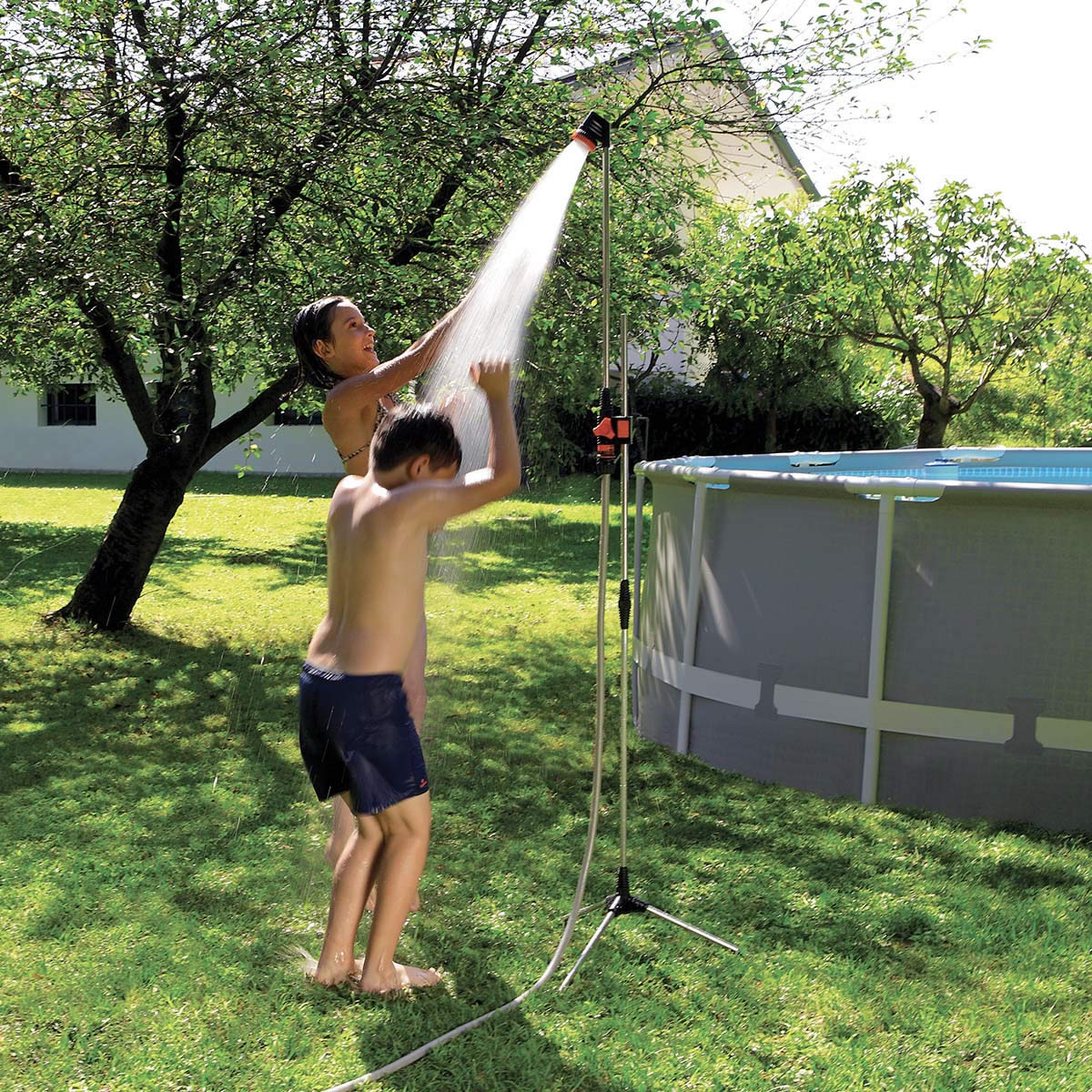 Refreshing shower with tripod support takes up very little space. Ready for immediate use, it is ideal for the garden, the patio, poolside and when camping.