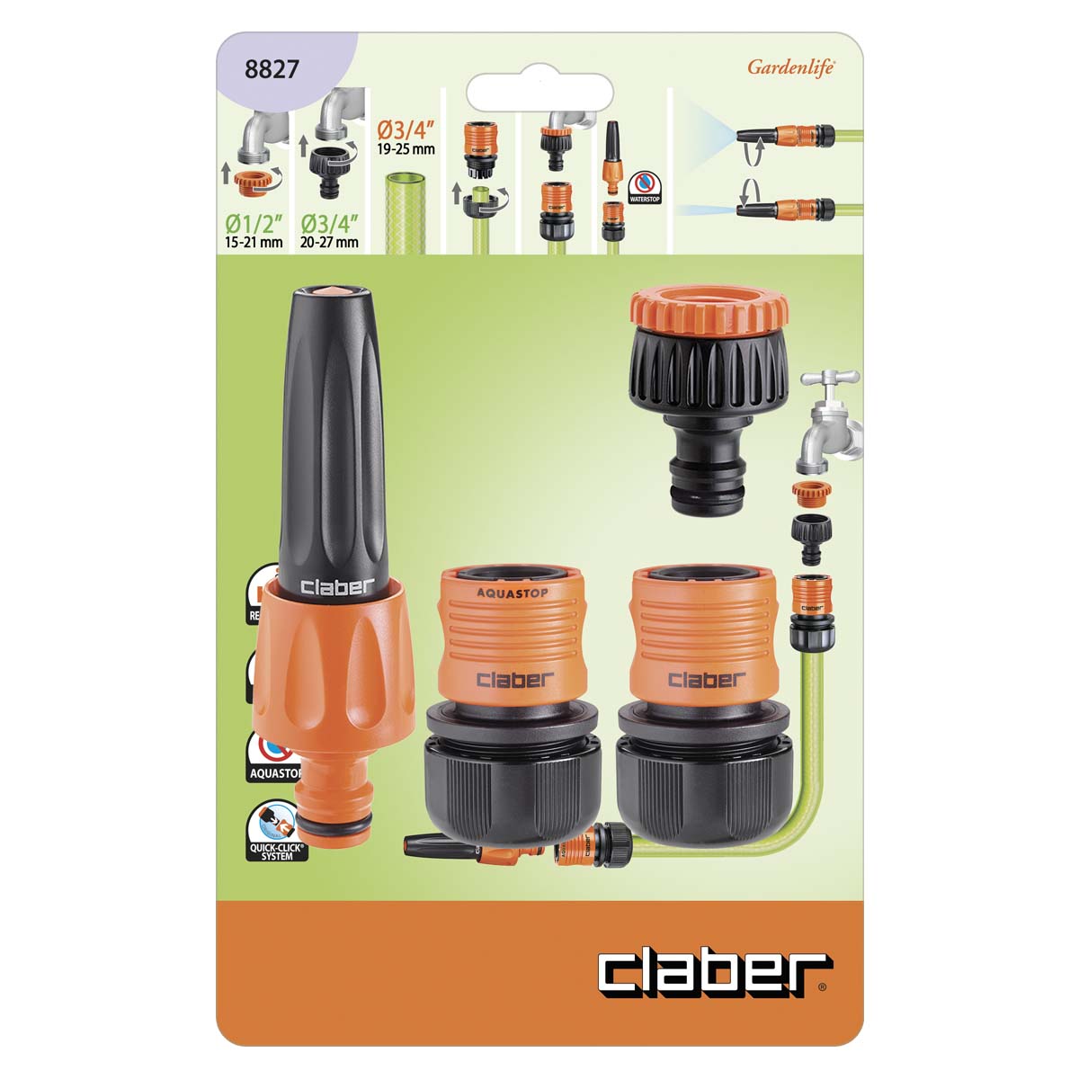 Contains: tap connector 3/4” (20-27 mm) and reducer 1/2” (15-21 mm), 3/4″ automatic couplings with and without aquastop, jet spray nozzle.