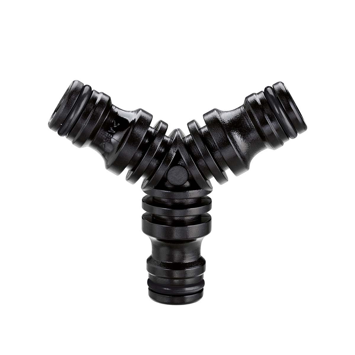 Connects three hoses with a ”click” and transforms a single irrigation line into a double line.