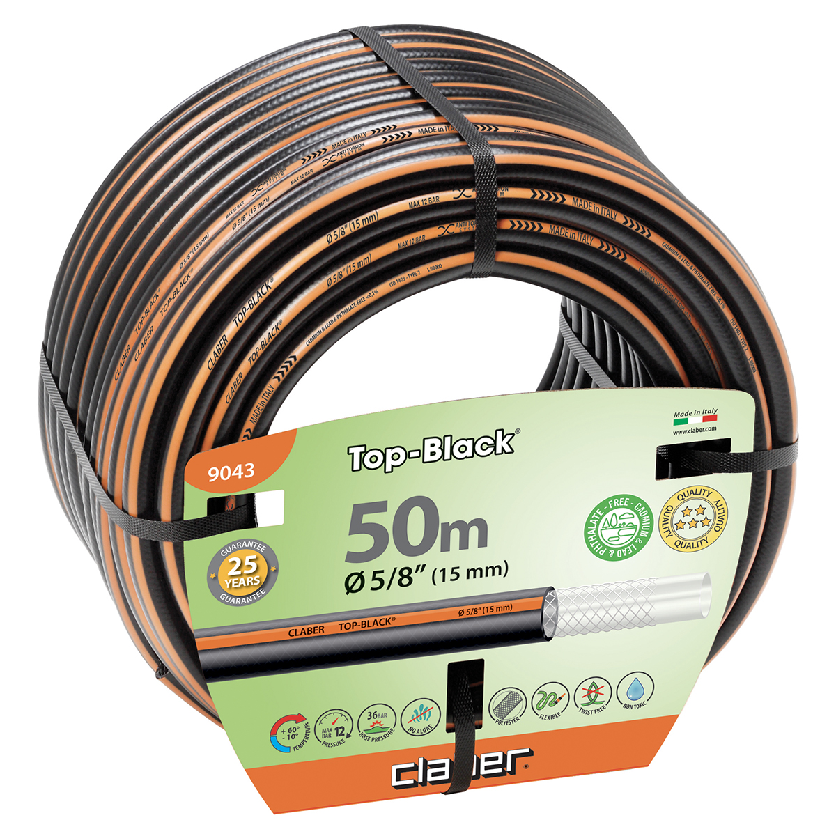 Kink-resistant hose with a special braided reinforcement that guarantees excellent stability at high water pressure; algae-resistant and UV-resistant. The Top-Black hoses are 100% safe, as they contain no heavy metals or phthalates. Garden irrigation hose 50 m length 5/8″ diameter 19-14 mm diameter Anti-algae treated Anti-UV treated Two layers Resistant to heavy use 10 R Maximum pressure