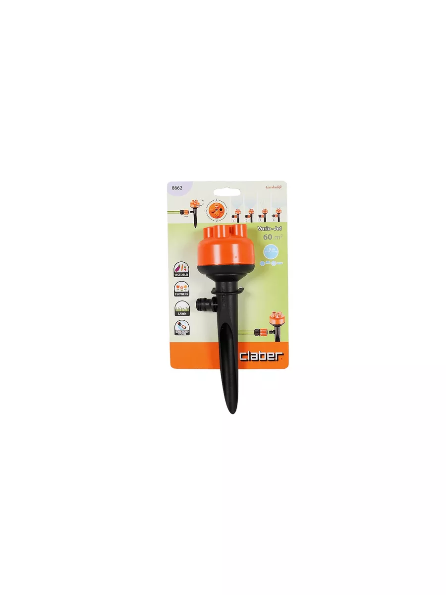 Multifunction static sprinkler. It features four different jets, which can be selected by turning the head: spray, blade jet, 360°, 180°. The stake has been designed to guarantee maximum stability. Quick-Click standard connection. Irrigated area max 64 m².